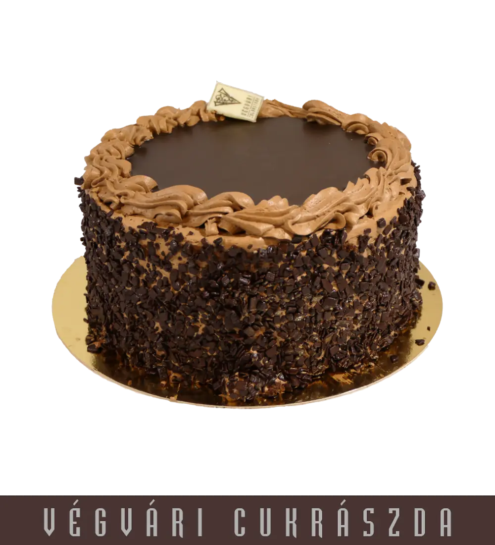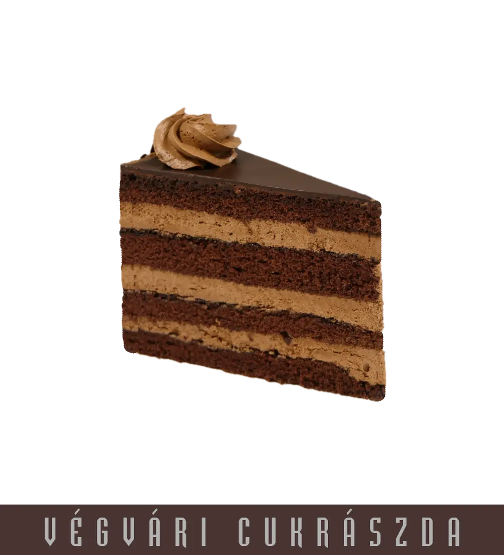 Kakaós piskóta, főzött tejszínes csokoládé vajkrémmel rétegezve. Roppanós csokoládé bevonattal, csokoládés vajkrémmel díszítve.
