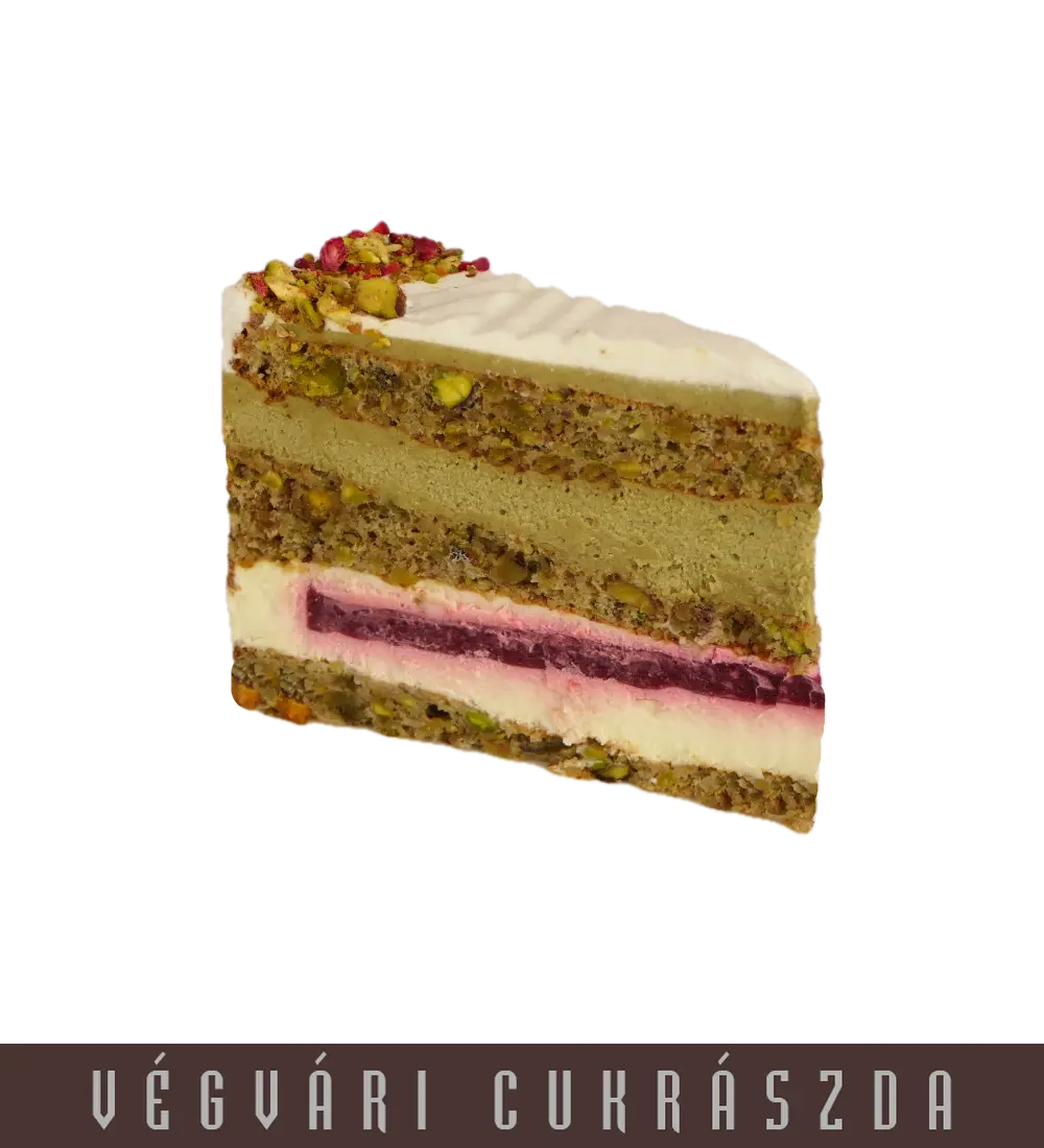 Pisztáciás piskóta, pisztácia krém és tejszín krém rétegezve, málna zselével.