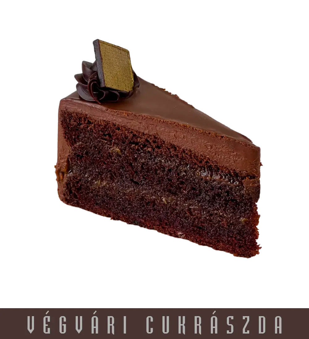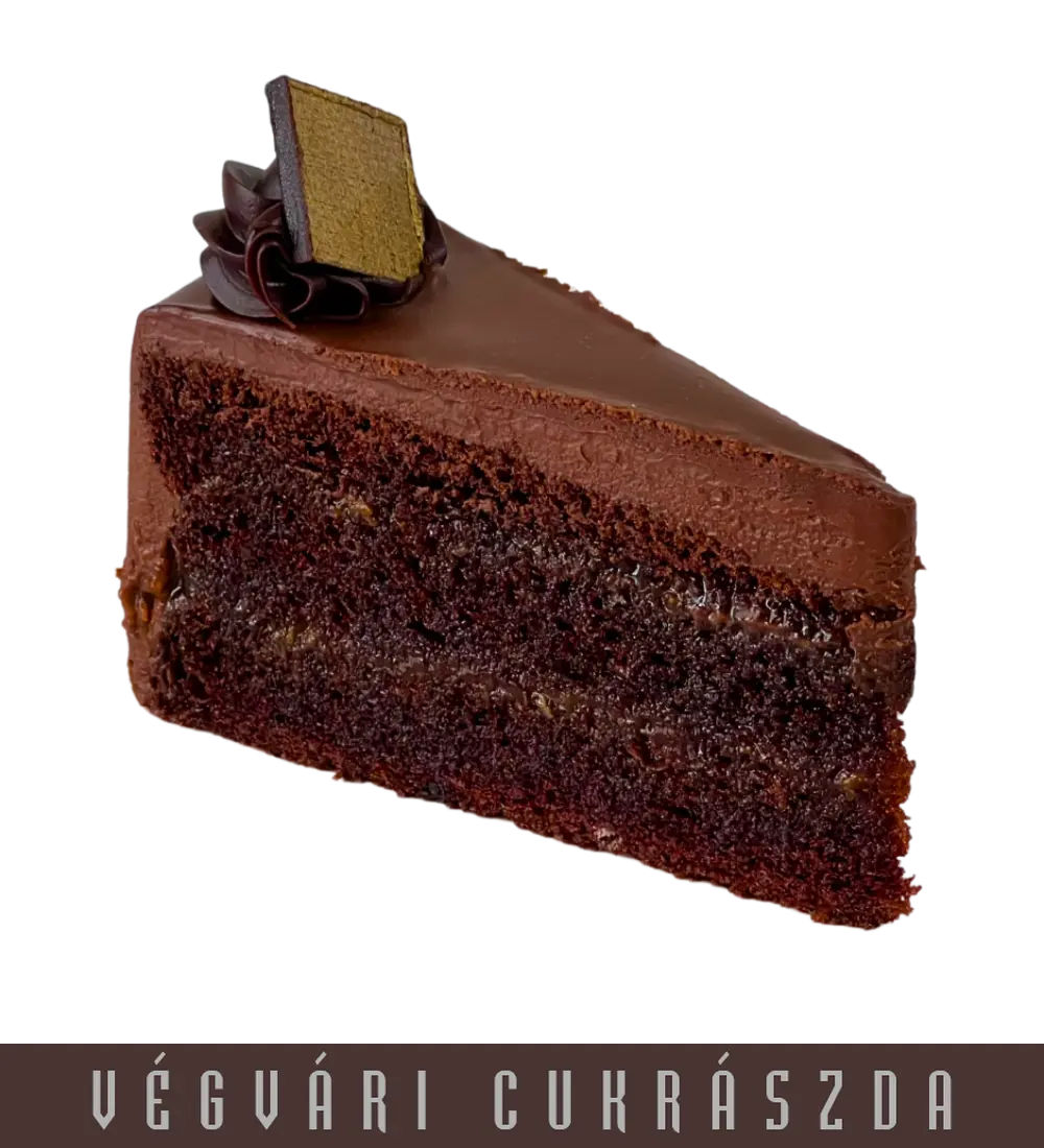 Sacher-piskótalapok közé zárt házi sárgabaracklekvár, étcsokoládé ganache-sal bevonva, párizsi krémmel díszítve.