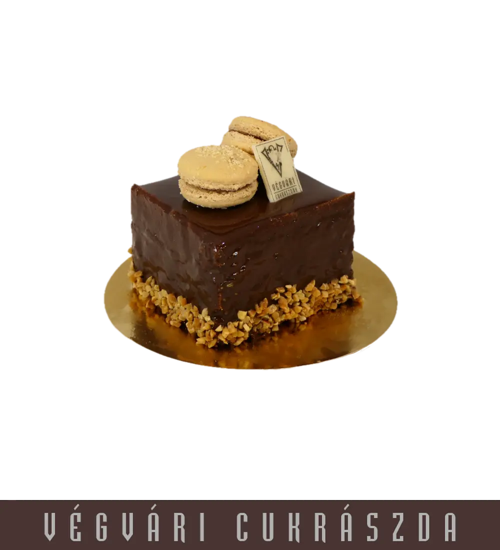 Búzalisztmentes Törökmogyorós piskóta, étcsokoládé praliné mousse krém, tejpraliné réteg, bevonata étcsokoládé glaze
