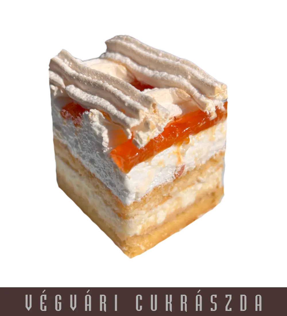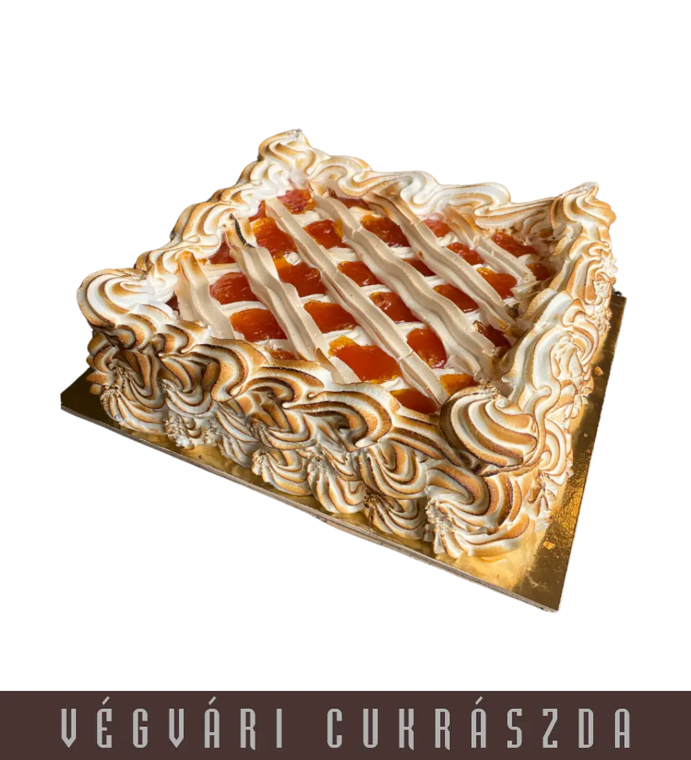 Linzer lapok között túró réteg, sárgabarack lekvár, tetején cukrozott tojáshab.